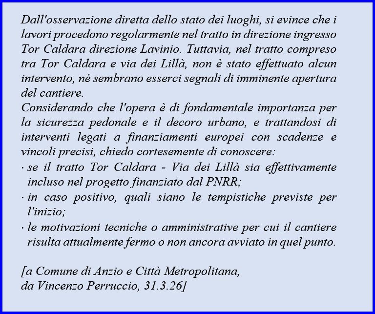 I lavori, iniziati nell’estate 2025 sono partiti da Lavinio in direzione centro città e appaiono oggi, aprile 2026, completati per oltre metà del percorso, essendo arrivati in corrispondenza del cancello d’ingresso della riserva. Rimangono quindi da coprire i circa 500 m che separano tale cancello dal traguardo, cioè via dei Lillà.