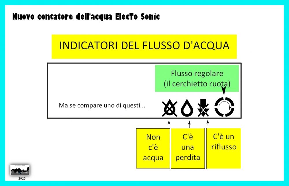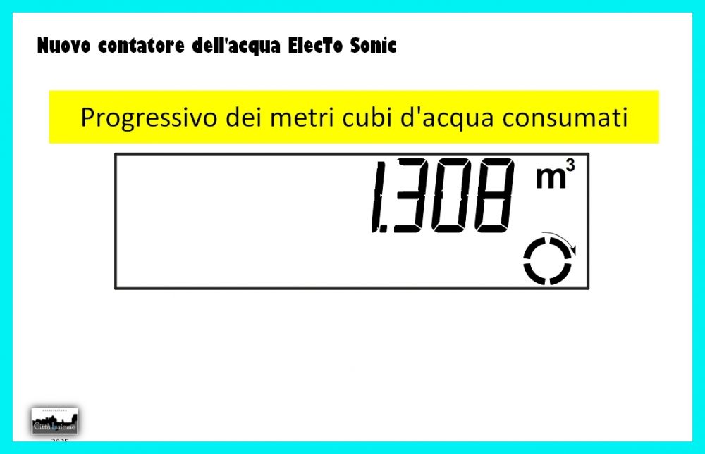 La vecchia stellina che vorticava nei vecchi contatori è diventata un cerchietto che gira nell’angolo destro in basso del display. Quando l’acqua scorre regolarmente nelle tubature il cerchietto gira in senso orario.