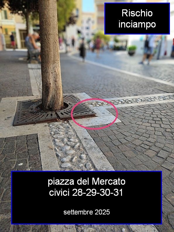 3) in piazza del Mercato davanti ai civici 28-29-30-31 le griglie in ferro alla base degli alberi sono sconnesse con pericolo di inciampo.