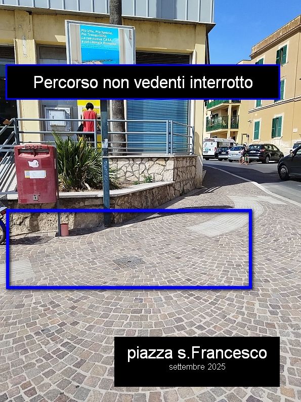 2) ancora in piazza S.Francesco, davanti all'uffico postale, la fascia guida per non vedenti si interrompe per un paio di metri (in quel punto il selciato insolitamente allineato denuncia che vi è stato un intervento senza ripristino della fascia in gomma);